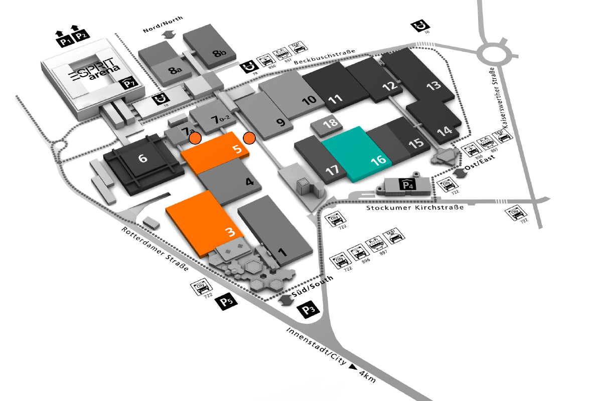 Hinweis: Klicken Sie auf die farbigen Flächen (orange und grün) im Messeplan.
